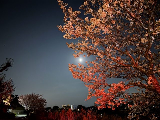 月灯りに照らされて夜桜がきれいでした。
