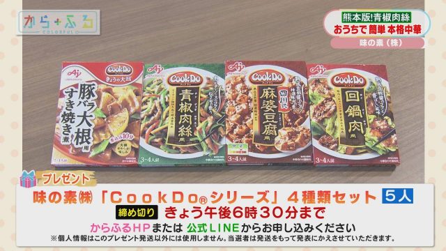 11月15日『からふるプレゼント!』 ☆味の素(株)「Cook Do Ⓡ シリーズ」4種類セットを5人にプレゼント☆ 当選人数 5人 番組で発表したキーワードをお書きの上ご応募ください 応募締切 きょう11月15日(土)午後6時30分 応募方法 応募フォームまたは公式LINE ★応募は→コチラ★