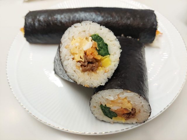 中央に1/4のご飯を置いて、手を濡らしながら、手前は薄めにきっちり、