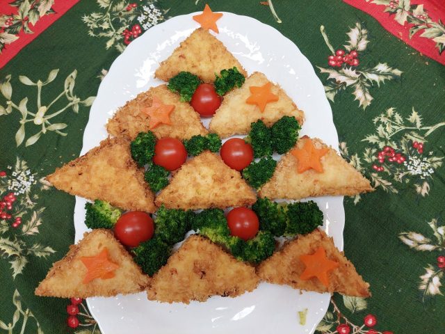 ④揚げたはんぺんと野菜などでクリスマスツリーをイメージして