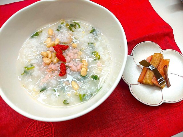 ③粥が炊き上がったら、塩、酒で味付けし、若葉を加えて火を止めたら、