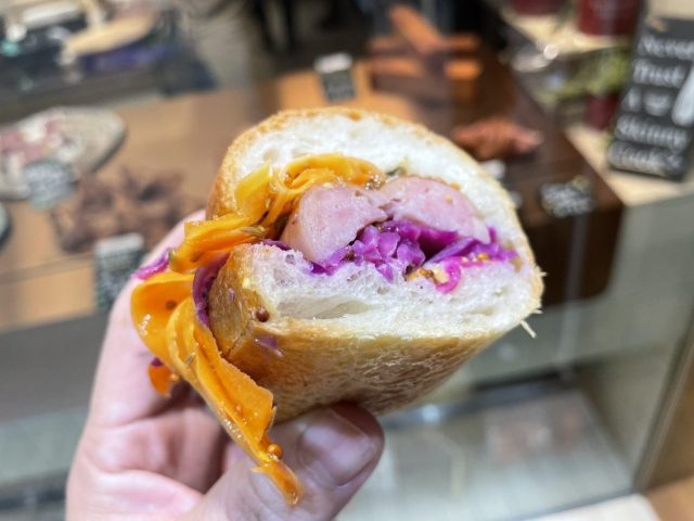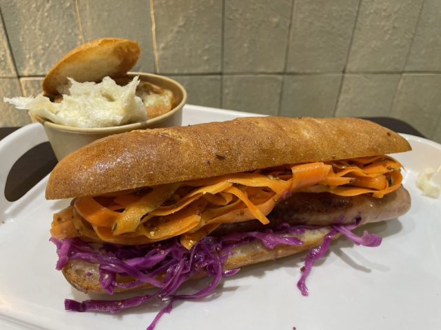 紫キャベツラぺ、ニンジンラぺ、阿蘇自然豚ソーセージ、自家製胡麻ソース