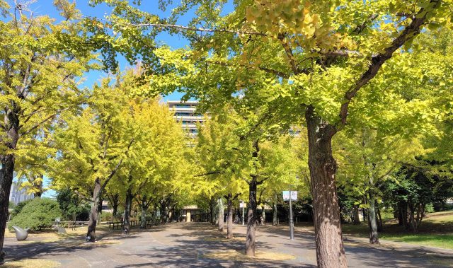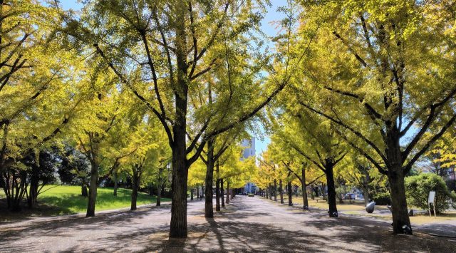 県庁プロムナードのイチョウが緑から黄色に