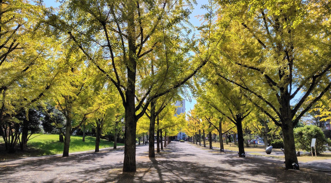 県庁プロムナードのイチョウが緑から黄色に