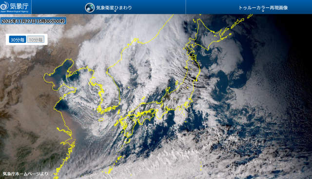 九州の西、東シナ海付近が茶色っぽく見えて、