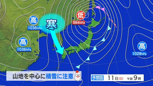 11日㊐は強い寒気も流れ込み雪が降る見込み。