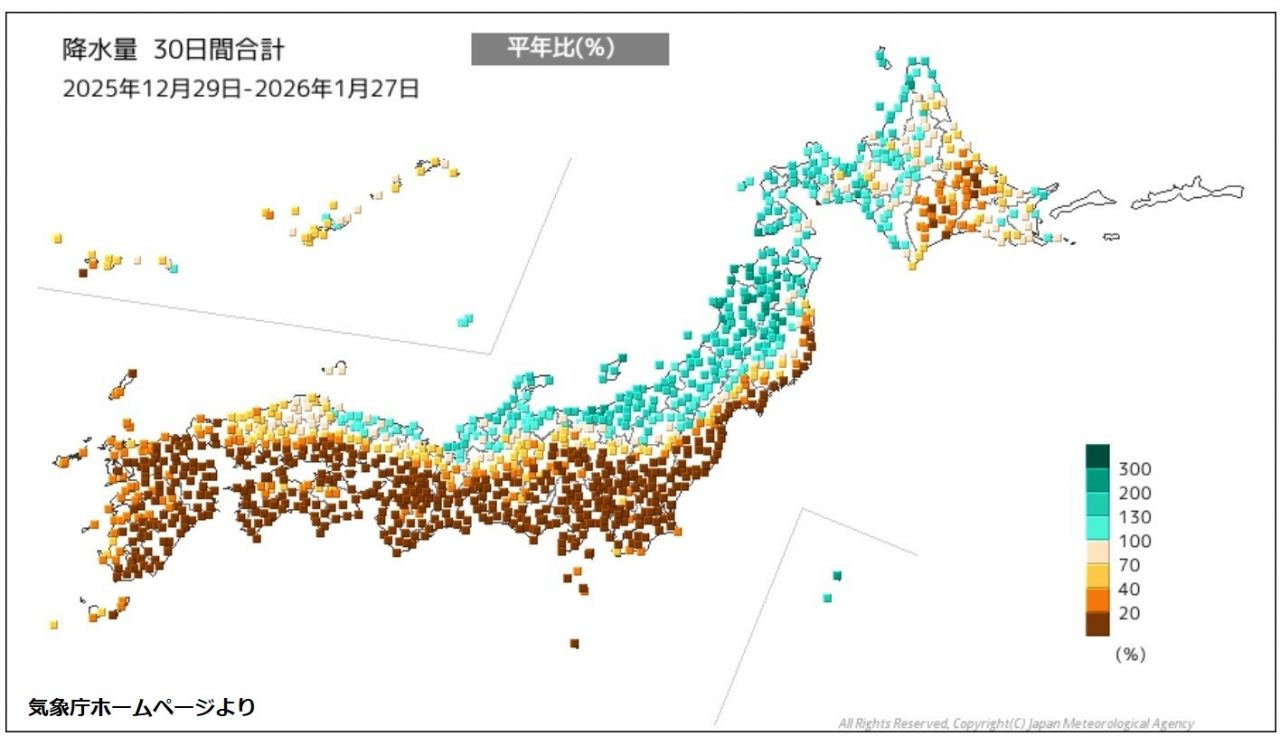 1月は平年でも降水量が最も少ない時期ですが、