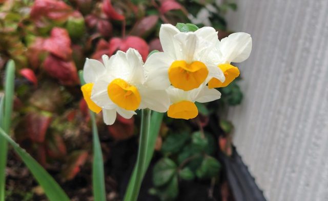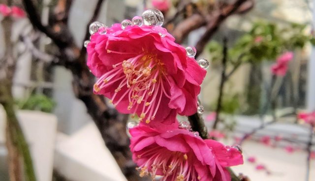 けさの雨で濡れた梅の花に…スイセンの花