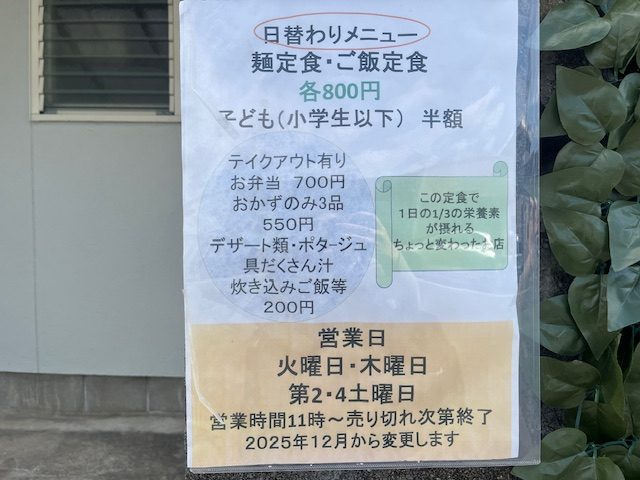 毎週火曜日と木曜日、そして毎月第2第4土曜日営業していて、2種類の定食から選ぶことができます。